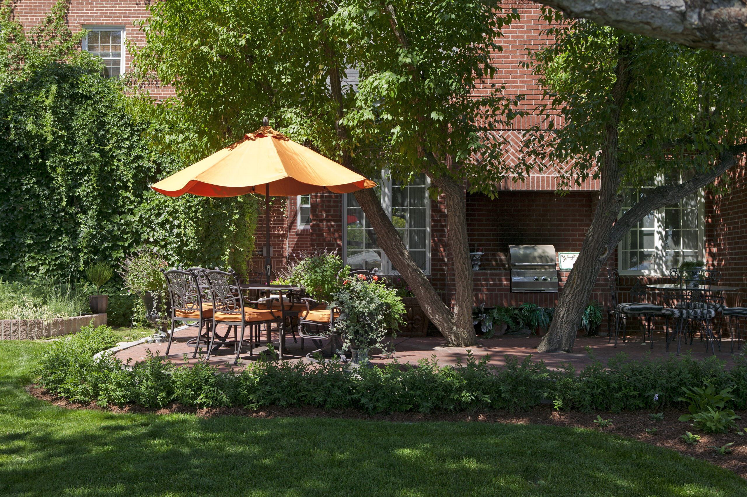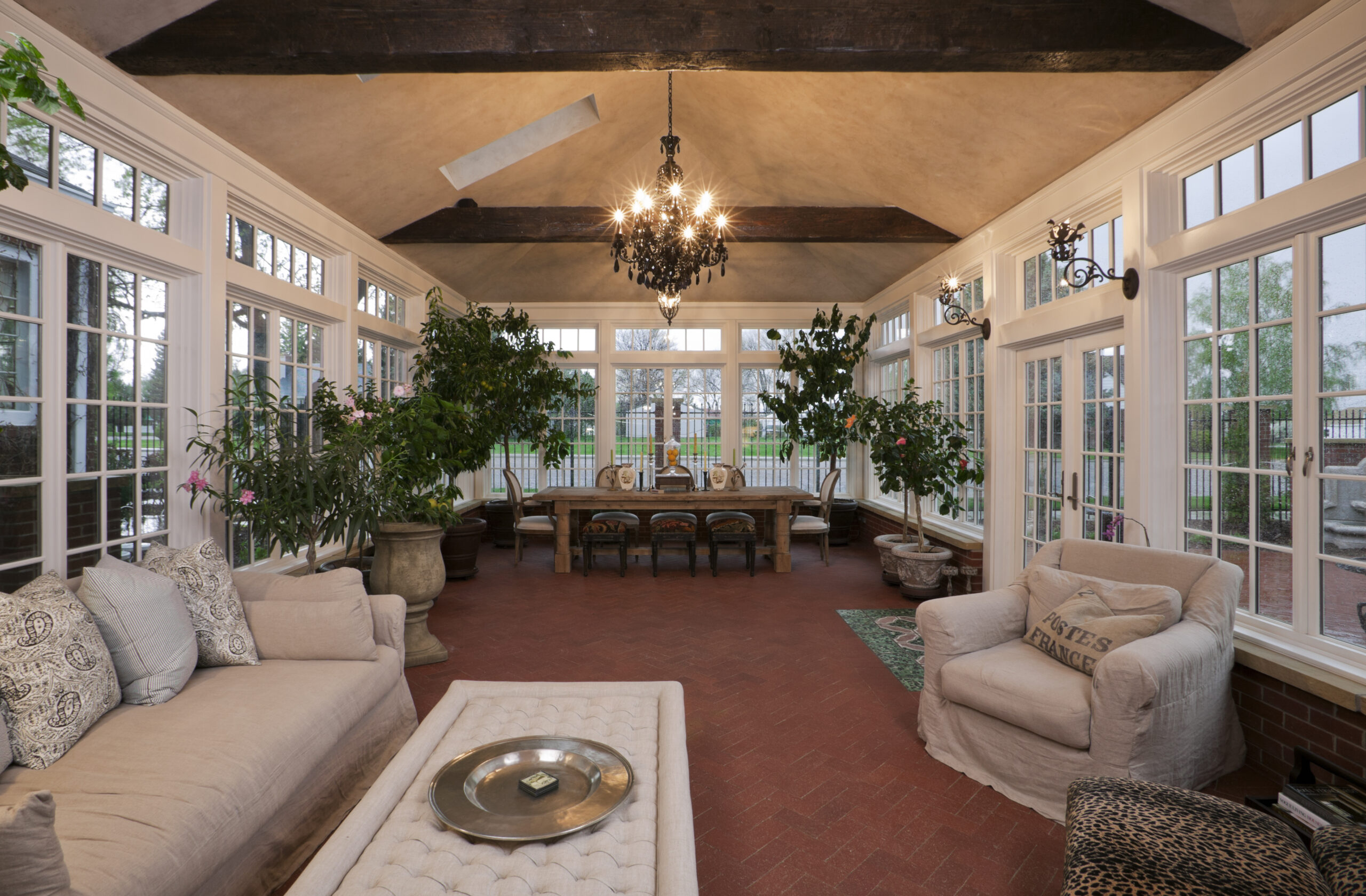 The newly added orangerie brings in abundant natural light and serves as a serene retreat, seamlessly connecting the interior with the surrounding landscape. This airy space, perfect for year-round enjoyment, combines classic architectural details with a contemporary touch, creating a warm and inviting atmosphere for relaxation or entertaining.